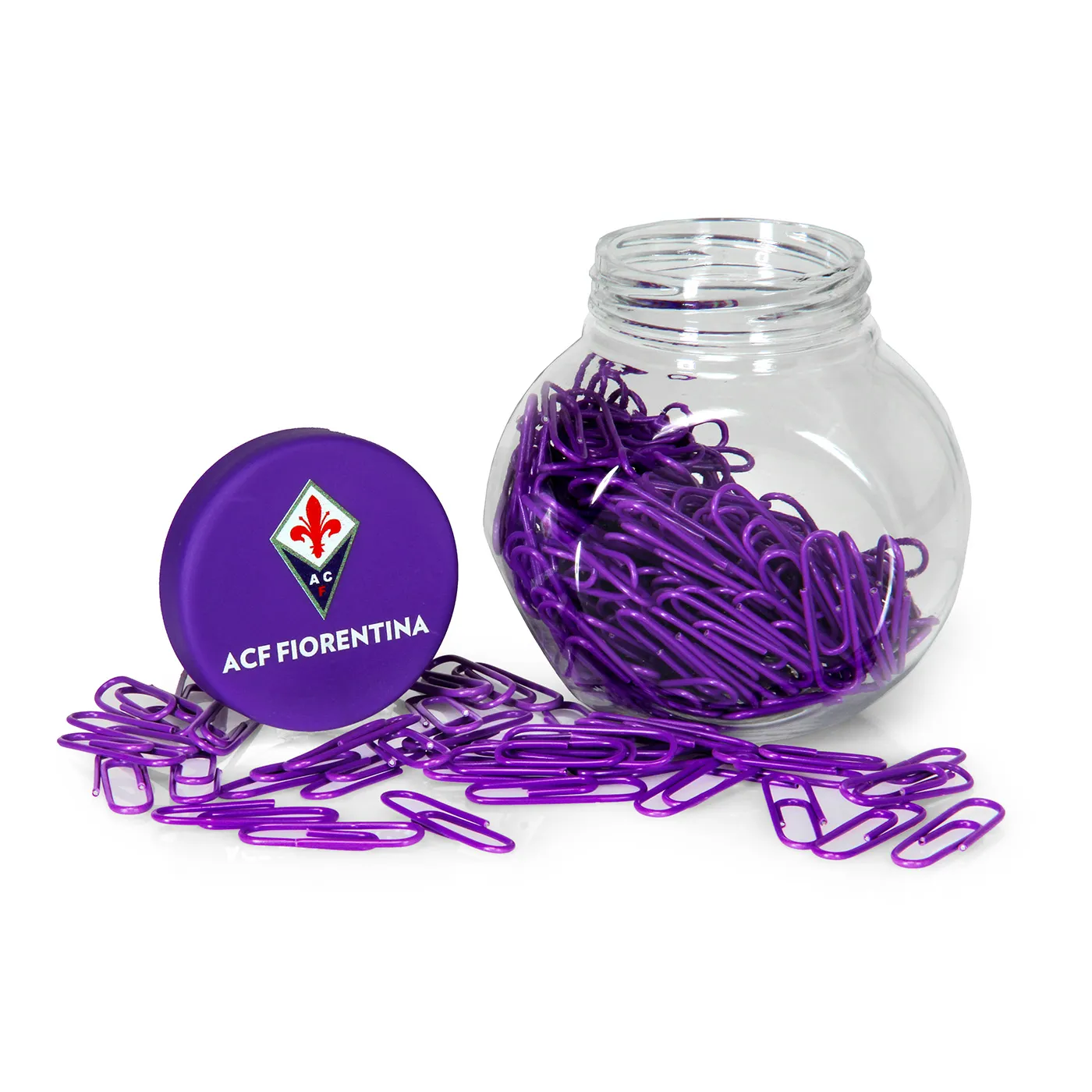 Fiorentina plastic box with purple paper clips.