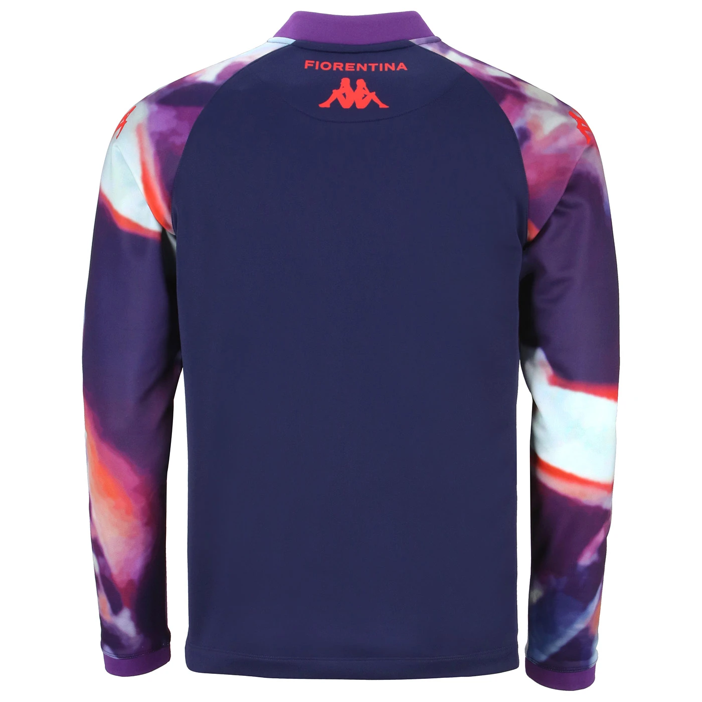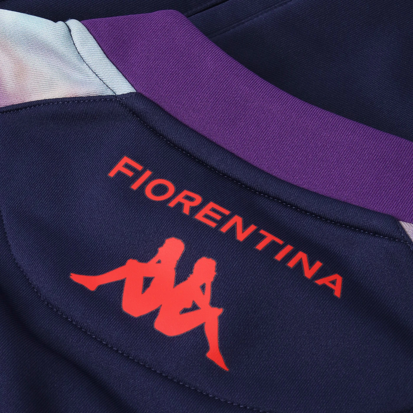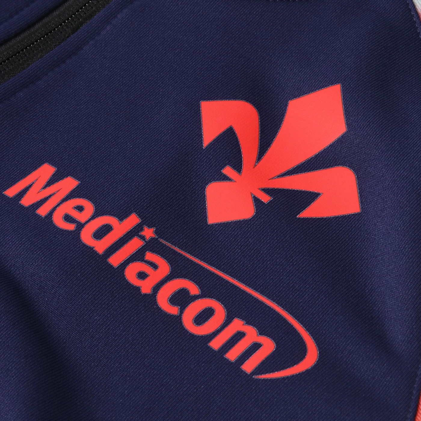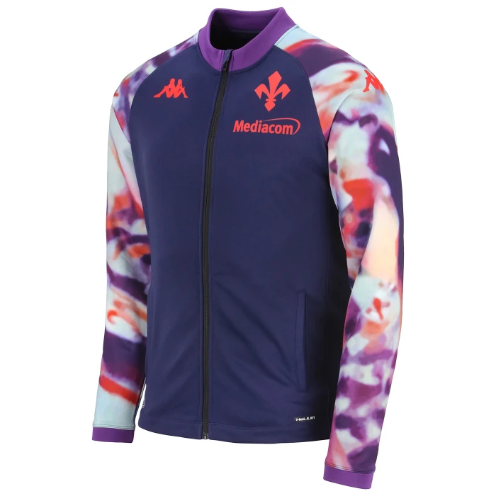 Slim fit with full front zip closure, sleeve hem insert, and printed graphics on the sleeves. Heat-applied transfer Kappa logos on the chest, sleeves, and back, along with the official ACF Fiorentina crest. Heat-applied transfer lettering on the back and sponsor on the front.
