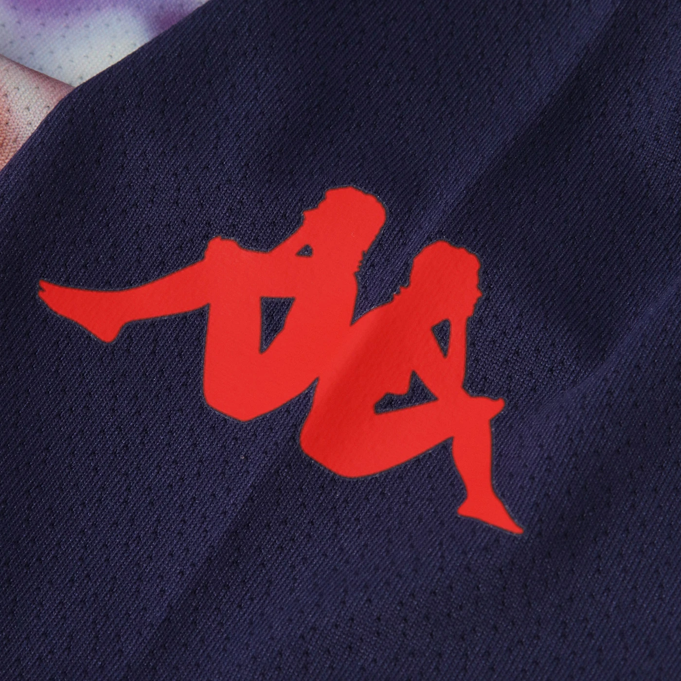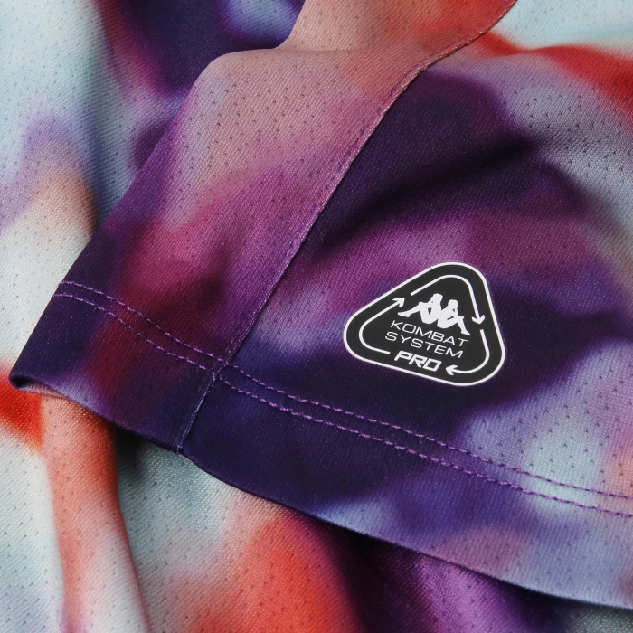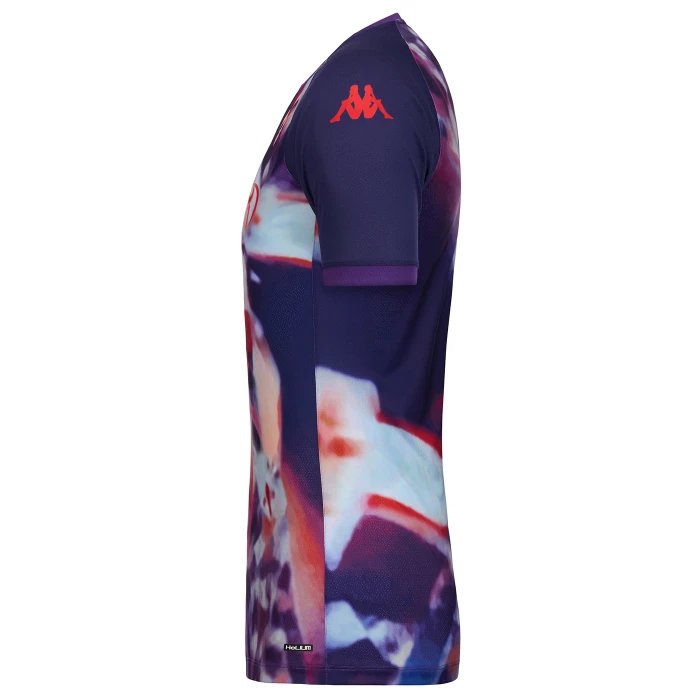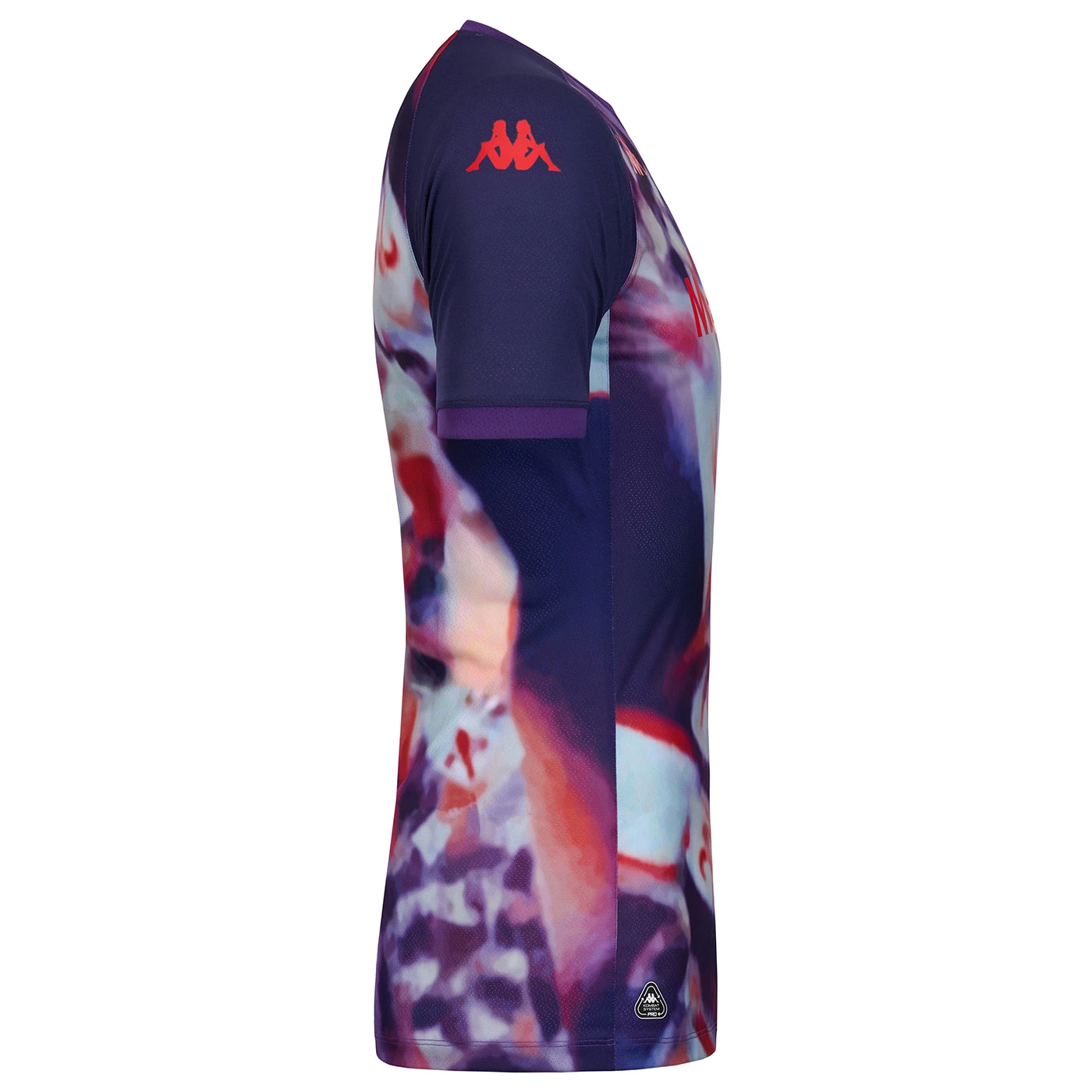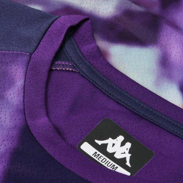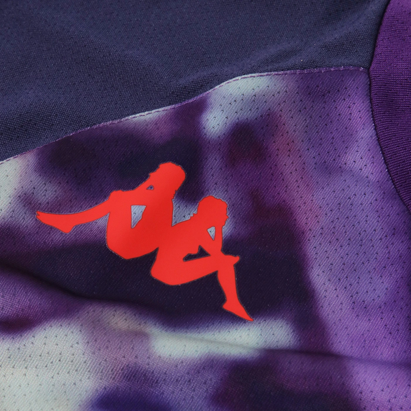 Slim fit, short sleeves, crew neck, sleeve hem insert, and printed graphics on the front and back. Heat-applied transfer Kappa logos on the chest, sleeves, and back, along with the official ACF Fiorentina crest.