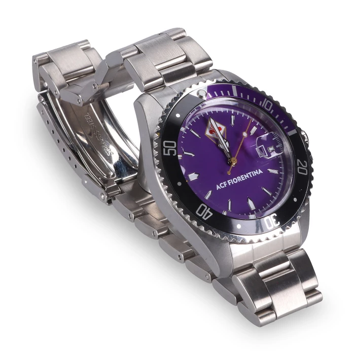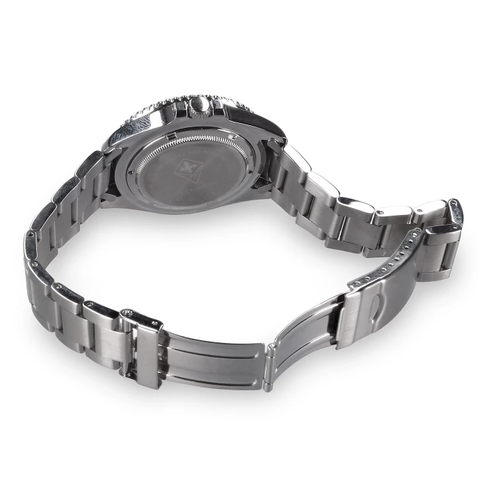 Watch with stainless steel case and mineral glass. Steel bracelet strap with buckle closure. Quartz movement, water resistance, 100 mt. 2 years warranty.