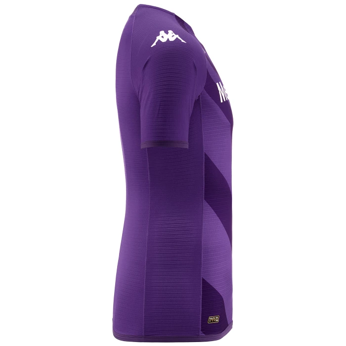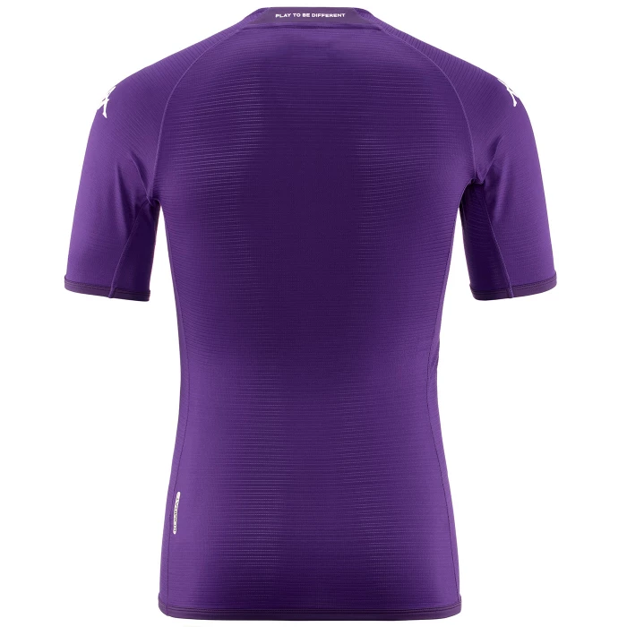 Fiorentina's first official jersey for the 2022/2023 season. \x0d\x0aThe design of the 22/23 jersey is inspired by the geometries of Fiorentina's new logo and enhances the Club's identity elements: the diamond shape of the crest that branches out pulsating from the heart, the V of I VIOLA and the motto PLAY TO BE DIFFERENT. \x0d\x0aIn the Home kit, concentric squares radiate from the Club's new logo, in alternating shades of purple so as to evoke the heartbeats and passion of those who wear and support the purple jersey. \x0d\x0aOn all the jerseys, on the inner side of the collar, there are instead 13 lilies: a tribute to the 12th man and to Davide Astori, the unforgettable number 13, loved by his teammates and by all of Florence. \x0d\x0aThe Kappa® Kombat™ Pro 2023 is further refined in its ultralight fabrics and Nylon stretch seams to ensure maximum comfort and elasticity. Hydroway Protection Technology ensures high breathability and effective release of body heat. Every detail and customization element is designed to nullify chafing on the skin.