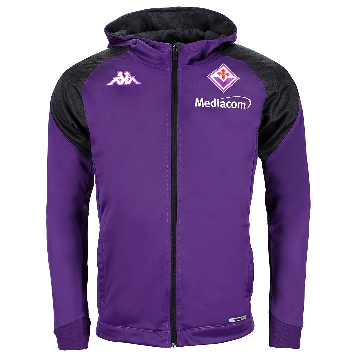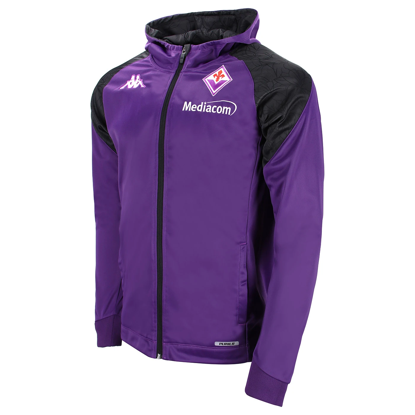 GARA. Official tracksuit for man in tricot fabric. SLIM FIT. Hooded with front full zip opening, insert on sleeves; pant with waist elastic with inner drawcord, pockets with zip, insert on sides. Omini logo on chest and on back embroidered, back lettering printed and Team logo patch in gabardine. ACF FIORENTINA.