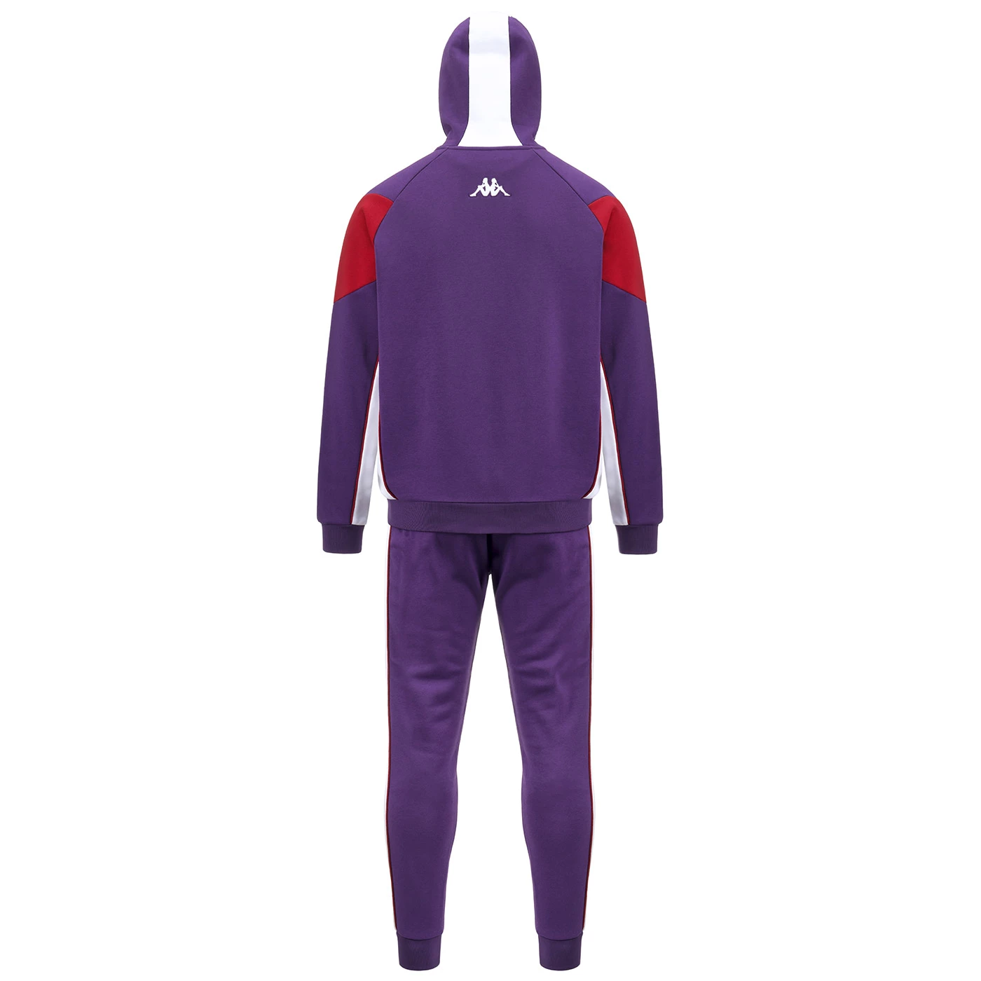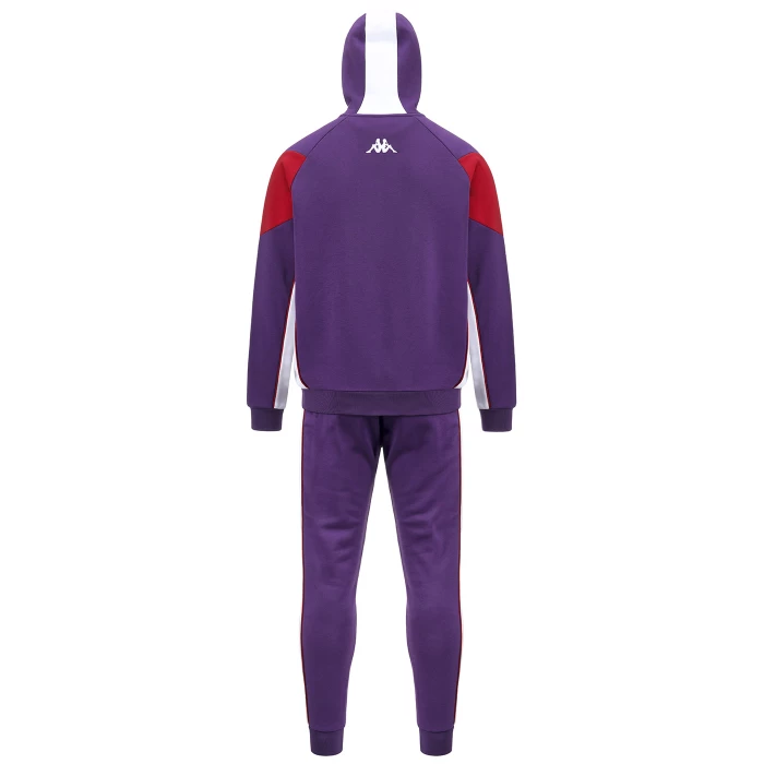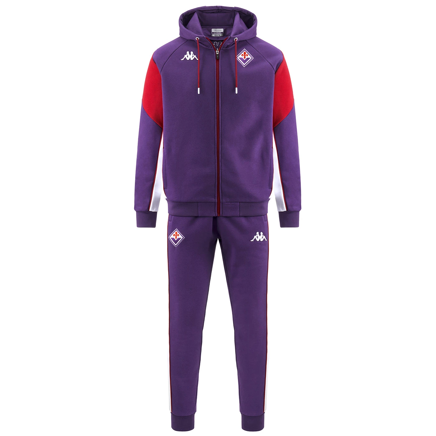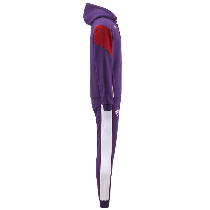 GARA. Man tracksuit in CVC rushed fleece. SLIM FIT. Fleece with fabric hood, rib borders, full zip in front, two front pockets without zip and sublimation graphic; pants with back pocket without zip and side pockets with zip, waist with elastic and drawcord and bottom body in rib. Team logo jacquard tape, Omini in gabardine and Team logo in gabardine. ACF FIORENTINA.Composition Entire Cotton 60 % Entire Polyester 40 %